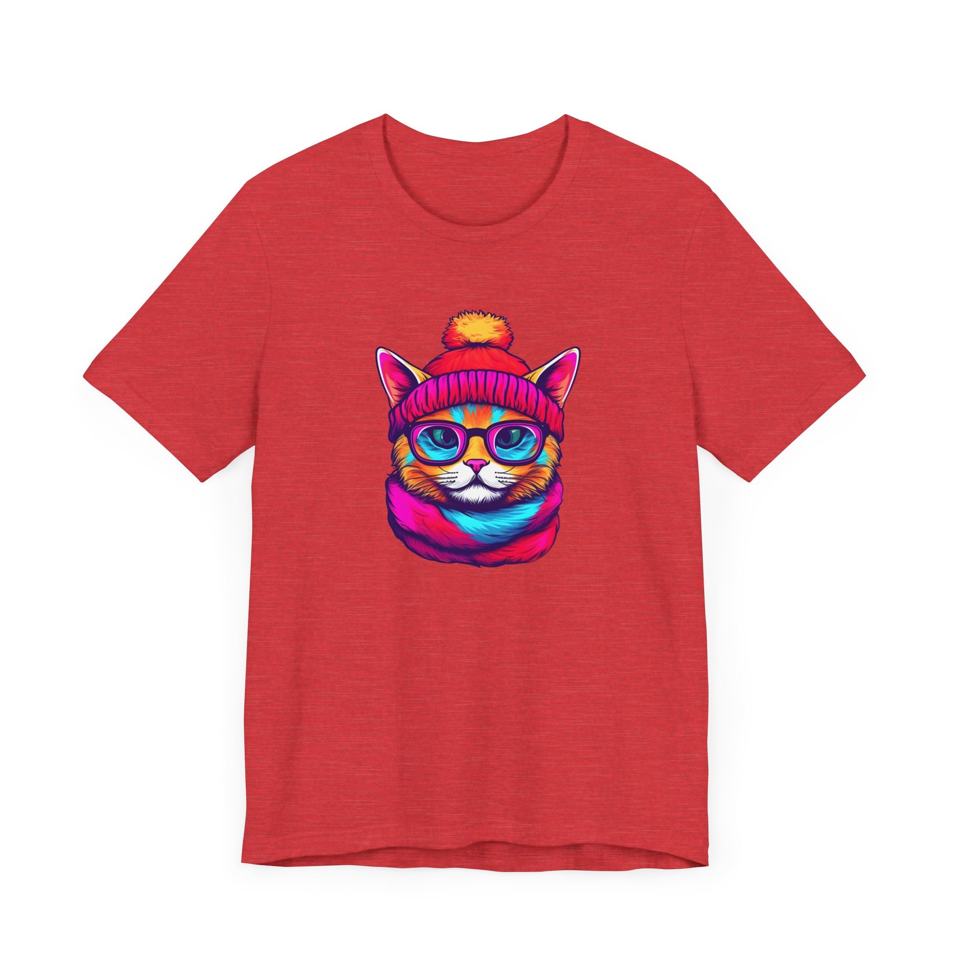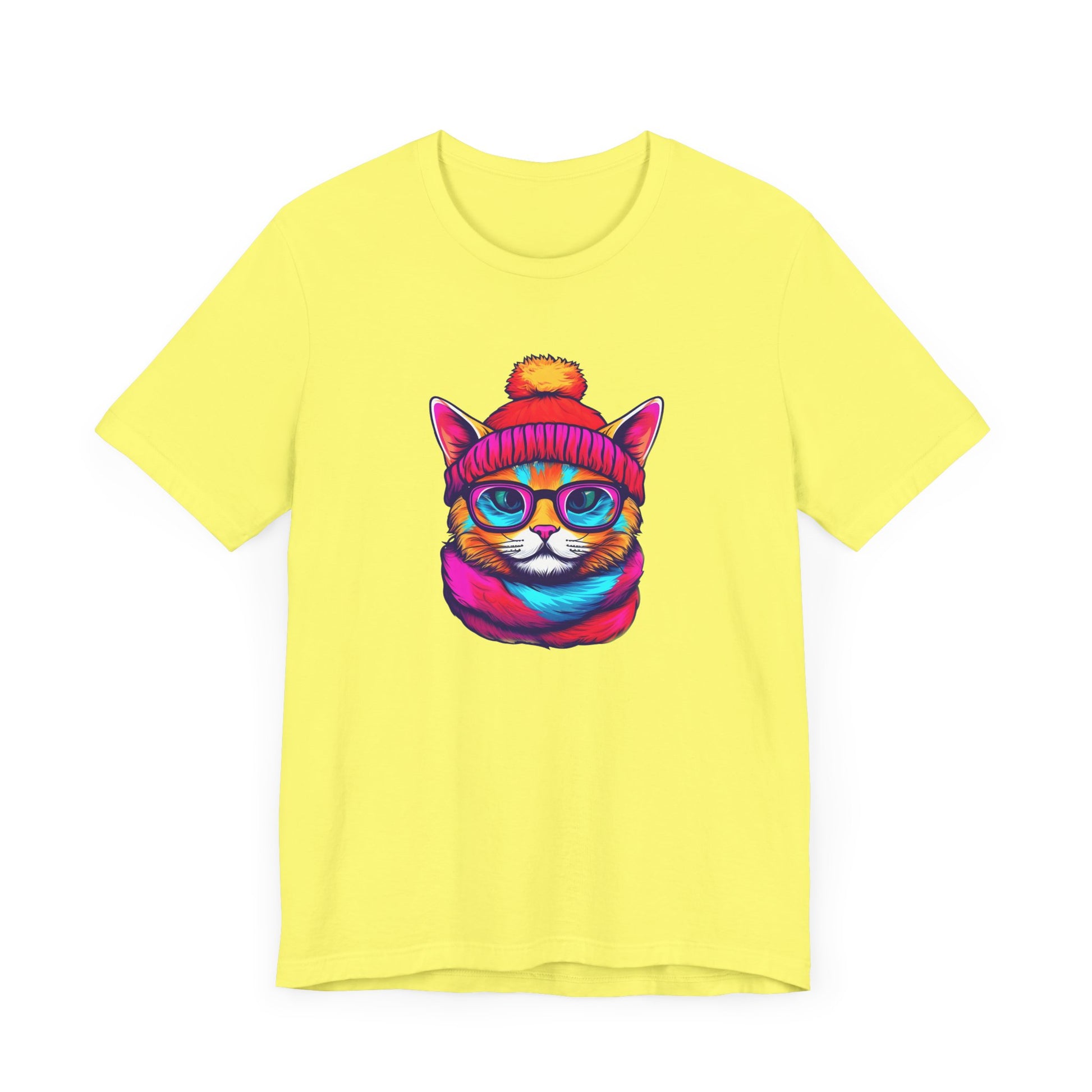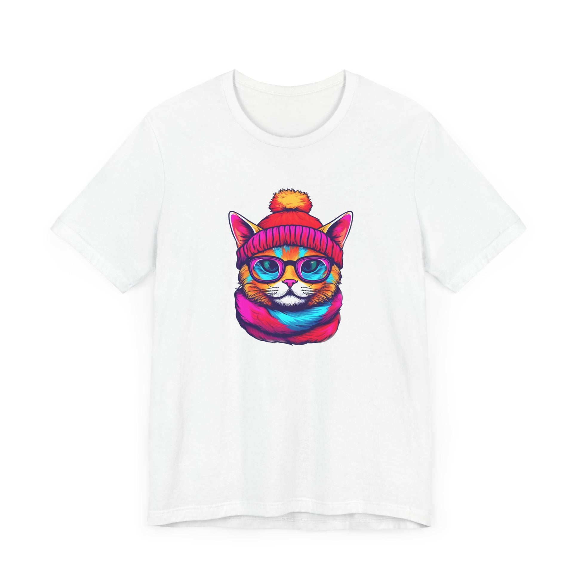 Introducing our vibrant and trendy Unisex Graphic Tee, a must-have addition to your wardrobe! This eye-catching tee features a delightful and whimsical hipster cat illustration that is sure to capture the attention of all cat lovers and fashion enthusiasts alike.