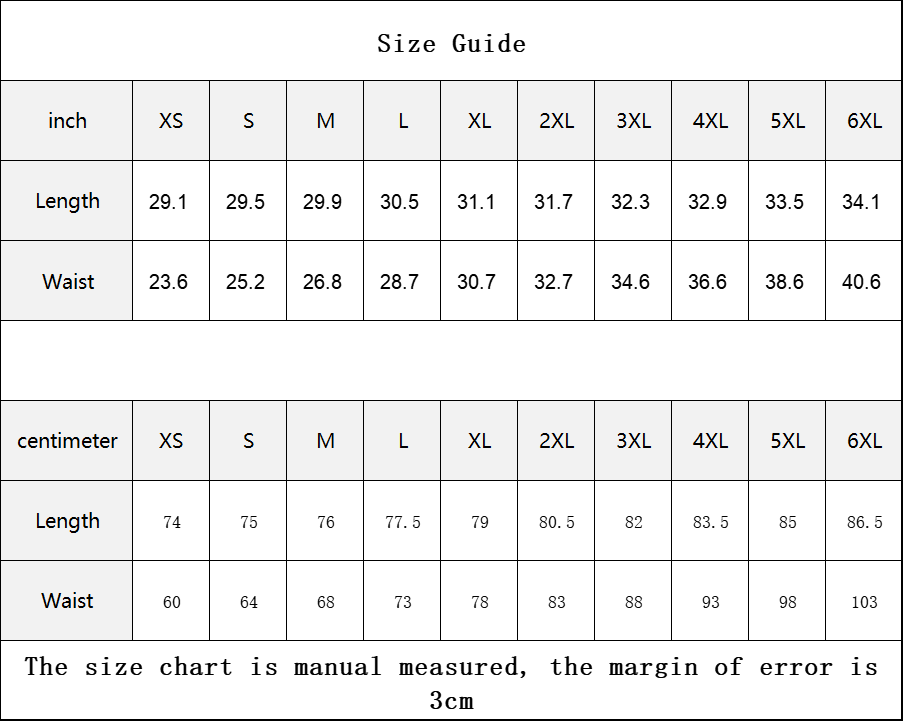 | Waist | 60 | 64 | 68 | 73 | 78 | 83 | 88 | 93 | 98 | 103 |