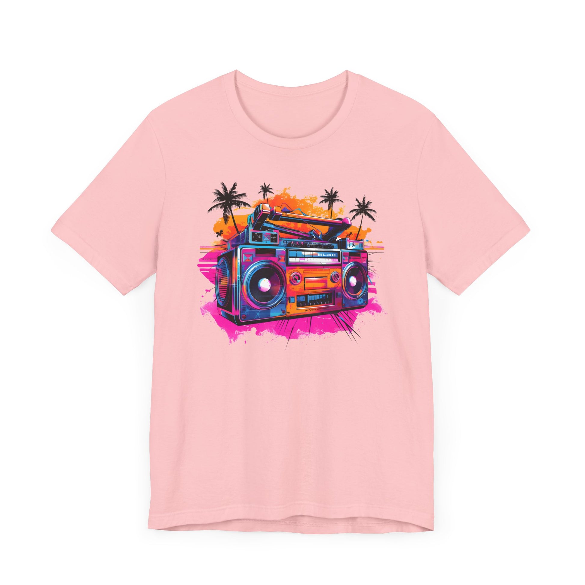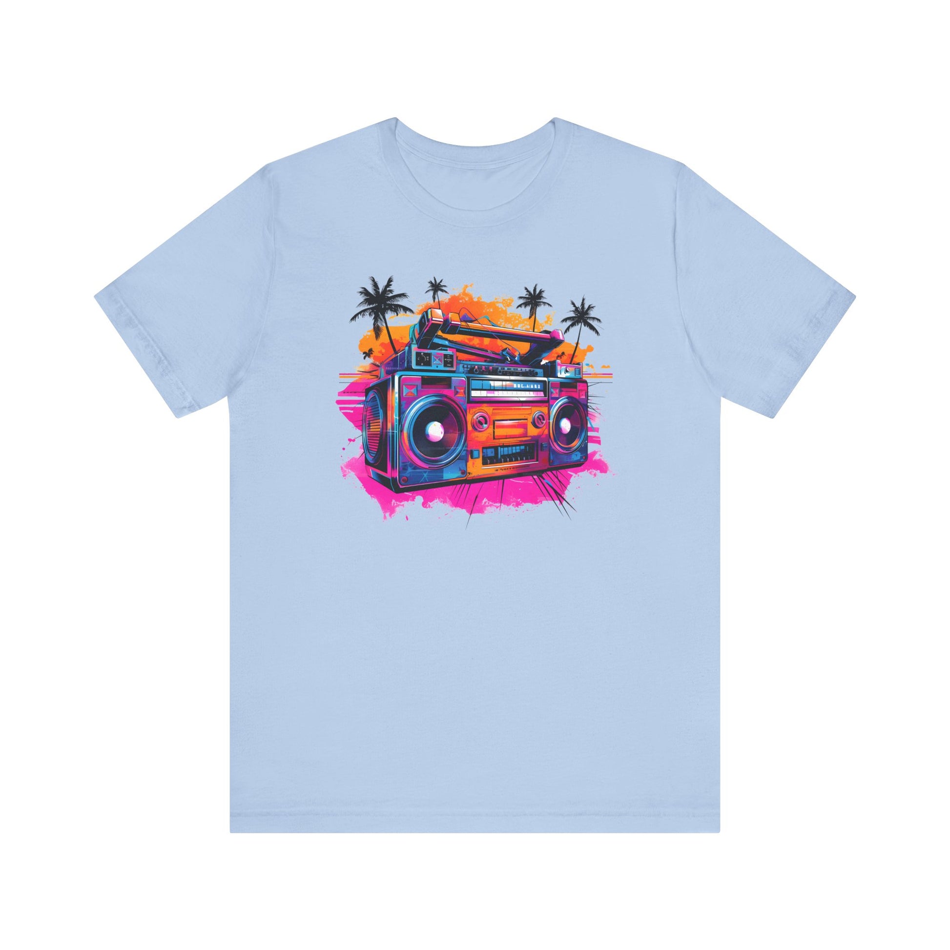 Introducing our vibrant Graphic Tee, a nostalgic blend of music and sunny vibes. This tee showcases a captivating illustration of a colorful boombox resting on the sandy shores of a tropical beach, inviting you to relive the carefree days of music and relaxation.