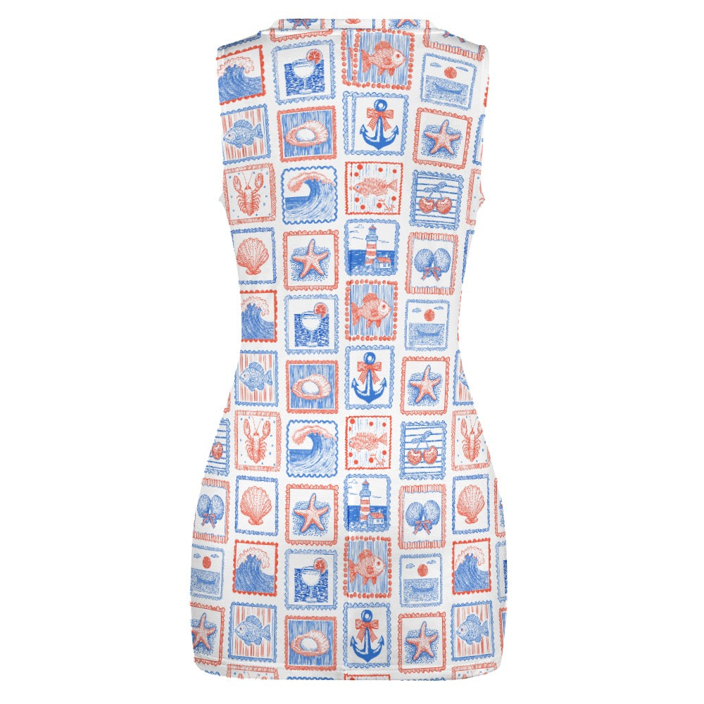 Step into coastal charm with this Seaside Postcard Cutout Dress, a playful piece featuring a nostalgic print of ocean icons like starfish, anchors, shells, and waves in soft red and blue tones. The clever cutout under the bust adds a breezy twist, while the form-fitting silhouette flatters every curve. Perfect for beach vacations, boardwalk strolls, or summer soirées, this sleeveless mini dress brings laid-back elegance with a splash of whimsy.