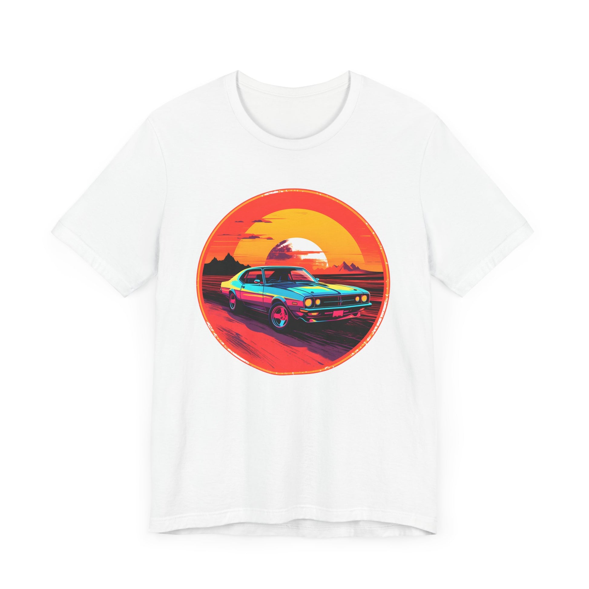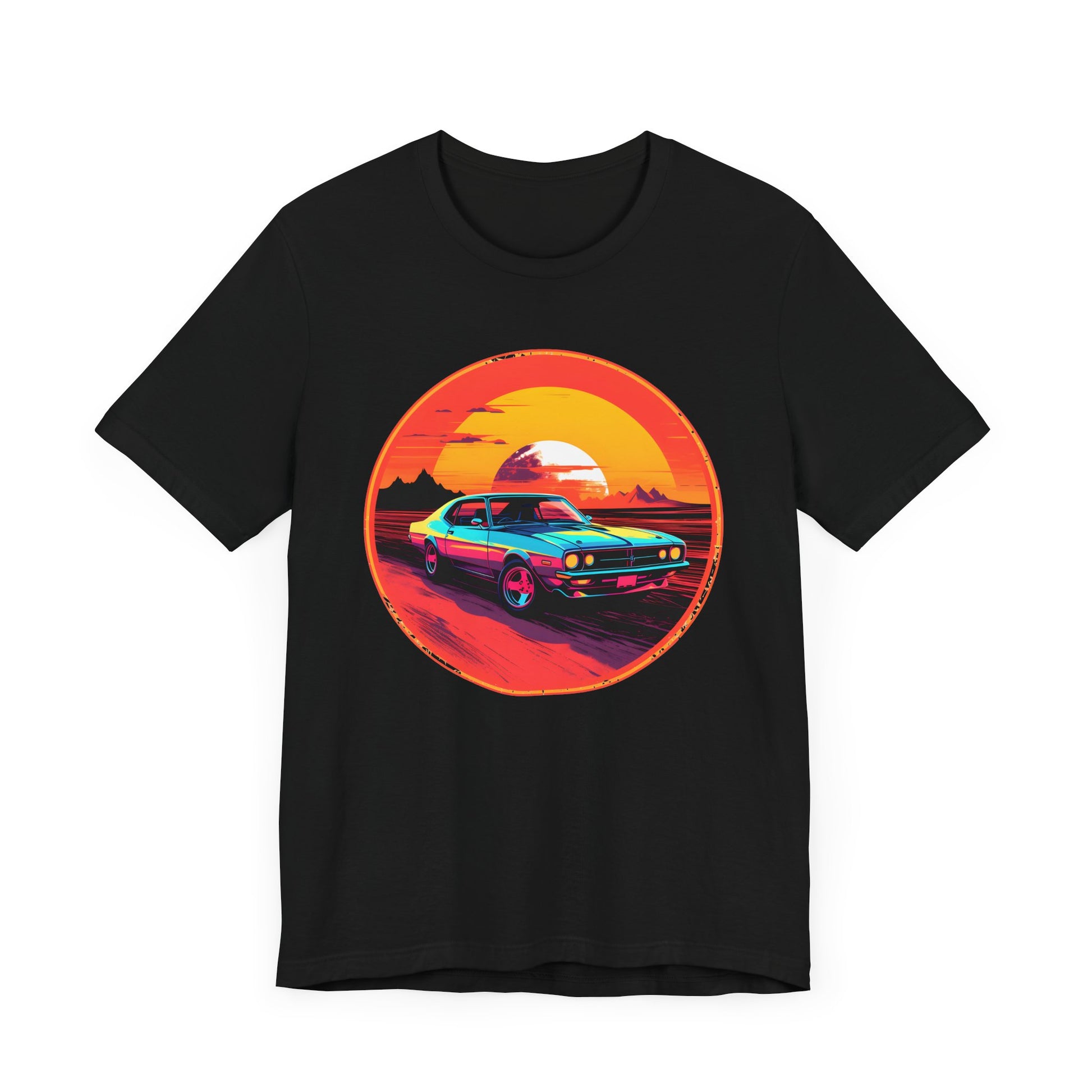 Introducing our captivating Graphic Tee, where the power of technology meets the allure of the open road. This tee showcases a mesmerizing illustration of a futuristic muscle car boldly cruising through the desert at sunset, capturing the essence of speed, adventure, and limitless possibilities.